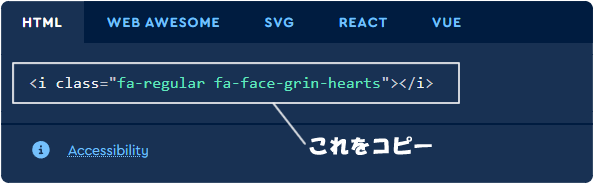 fontawesomeのサイトで検索して表示されたタグをコピー&ペースト。